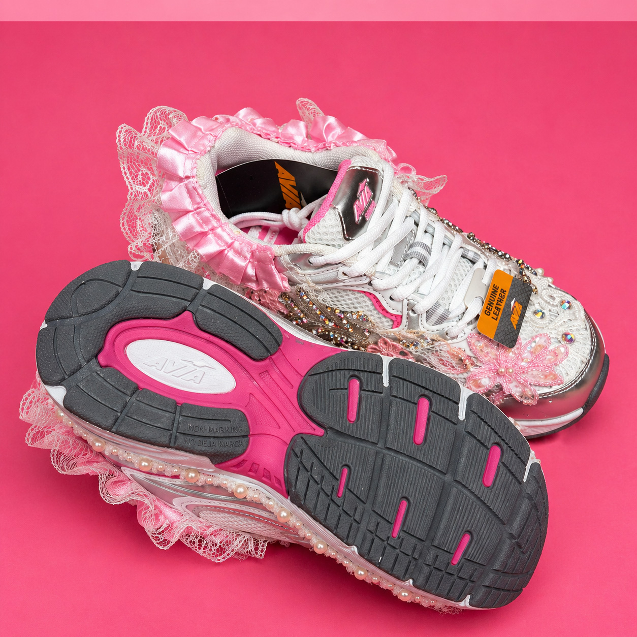 Delicate pink floral appliqués and shimmering crystal accents create a luxe, feminine vibe, while satin ribbon trim and ruffle details add a playful, couture-inspired finish. The neutral base with pops of pink makes these sneakers versatile enough to pair with casual looks or dress up for special occasions.